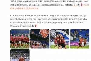 在蓉城隊(duì)史首場(chǎng)亞冠正賽惜敗之后,周定洋在社媒曬出現(xiàn)場(chǎng)照片并配文寫道:“今晚是我們首次亮相亞冠精英聯(lián)賽。為球隊(duì)的拼搏感到自豪,也感謝遠(yuǎn)赴韓國(guó)、始終高唱助威的球迷們。這只是開始,我們會(huì)從這里繼續(xù)前進(jìn)。成都雄起 ????????”