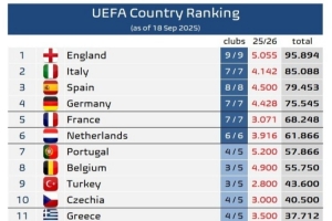 歐足聯(lián)旗下各協(xié)會(huì)歐戰(zhàn)積分情況: