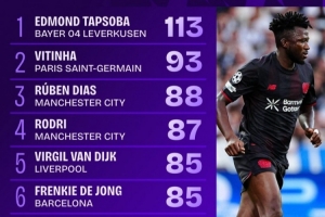 體育資訊9月19日訊 歐冠首輪今日全部戰(zhàn)罷,據(jù)Squawka的數(shù)據(jù)統(tǒng)計,勒沃庫森后衛(wèi)塔普索巴完成113次傳球,傳球準確率93%,另外他是本輪唯一完成傳球次數(shù)100+的球員。