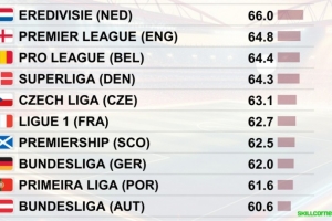 全文摘要:根據(jù)CIES數(shù)據(jù),在以時(shí)速超20公里且持續(xù)超1秒為定義的高強(qiáng)度跑動(dòng)排名中,荷甲球員以66.0的平均值位居榜首,英超以64.8緊隨其后,比甲和丹麥超分列三、四位。